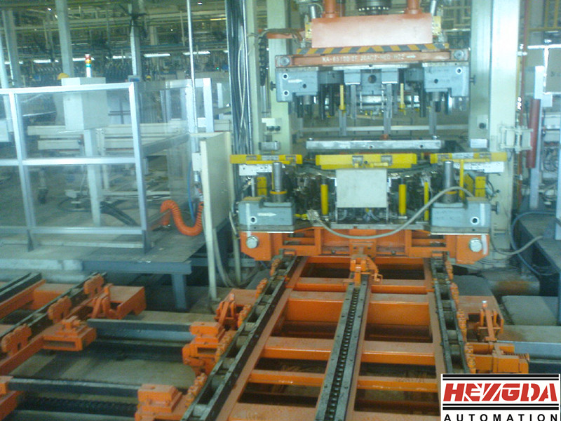 ?、谝慌_(tái)機(jī)器帶一個(gè)雙工位換模小車的結(jié)構(gòu),換模小車在機(jī)器后側(cè)左右移動(dòng)實(shí)現(xiàn)模具更換,在機(jī)器的左右側(cè)或前側(cè)布置上下料機(jī)構(gòu)。包邊液壓機(jī)的噸位小,臺(tái)面尺寸偏大,所以均采用雙活塞缸結(jié)構(gòu),以便均布液壓機(jī)的受力。為降低成本,在客戶沒有特別強(qiáng)調(diào)的情況下油缸及拉桿在技術(shù)協(xié)議中均取消鍛鋼的描述,而敘述為優(yōu)質(zhì)鋼材。包邊液壓機(jī)主要用于汽車四門兩蓋的門板的壓合工藝,噸位選擇一般為150-250噸,從我廠目前已生產(chǎn)的包邊機(jī)看,150噸、200噸的占所有產(chǎn)品份額的90%以上,其中又以200噸的居多,所以包邊液壓機(jī)的標(biāo)準(zhǔn)噸位定位200噸。汽車包邊模具的尺寸大部分在2000-2800mm之間,高度在500-1000mm之間,因此包邊壓機(jī)的工作臺(tái)有效尺寸按照3個(gè)檔次設(shè)置:3200*2800mm、3000*2600mm、2600*2400mm;包邊壓機(jī)的開口尺寸定為2000mm,行程1450mm,基本可以涵蓋所有包邊模具的使用。